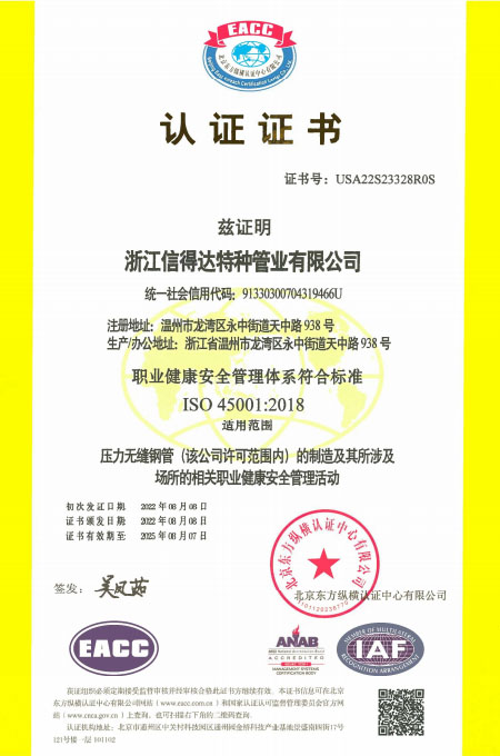 公司已全面通過了ISO9001:2008質量管理體系認證、14000環境管理體系認證、18000職業健康管理體系認證、國家質量檢驗檢疫總局A2-B類壓力管道元件制造許可、 歐盟PED認證及德國AD-2000產品強制認證、美國ASME材料產品認證、信得達擁有1條穿孔生產線,10條冷拔生產線8條冷軋特種無縫鋼管生產線。